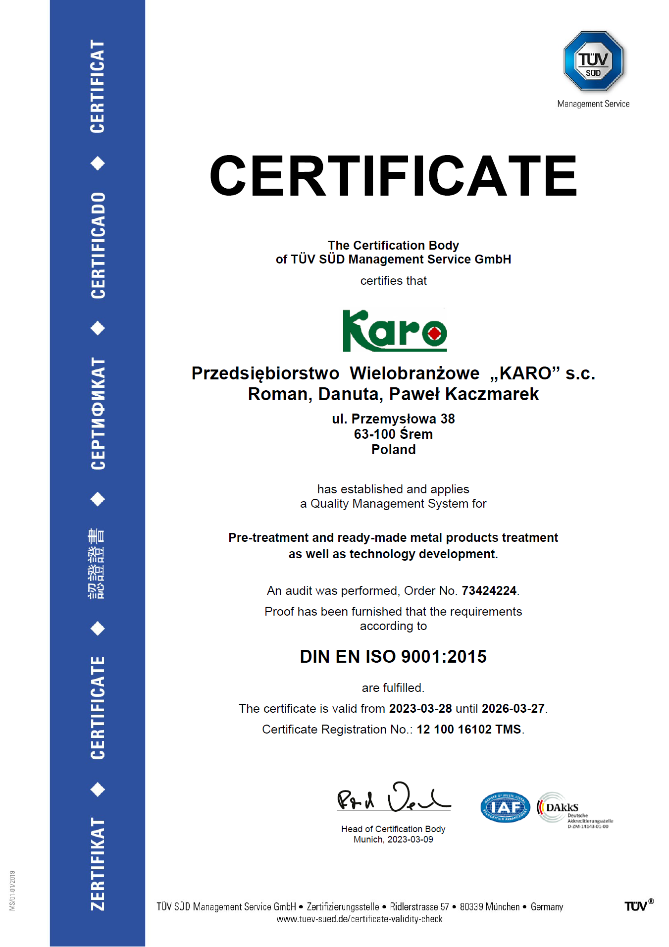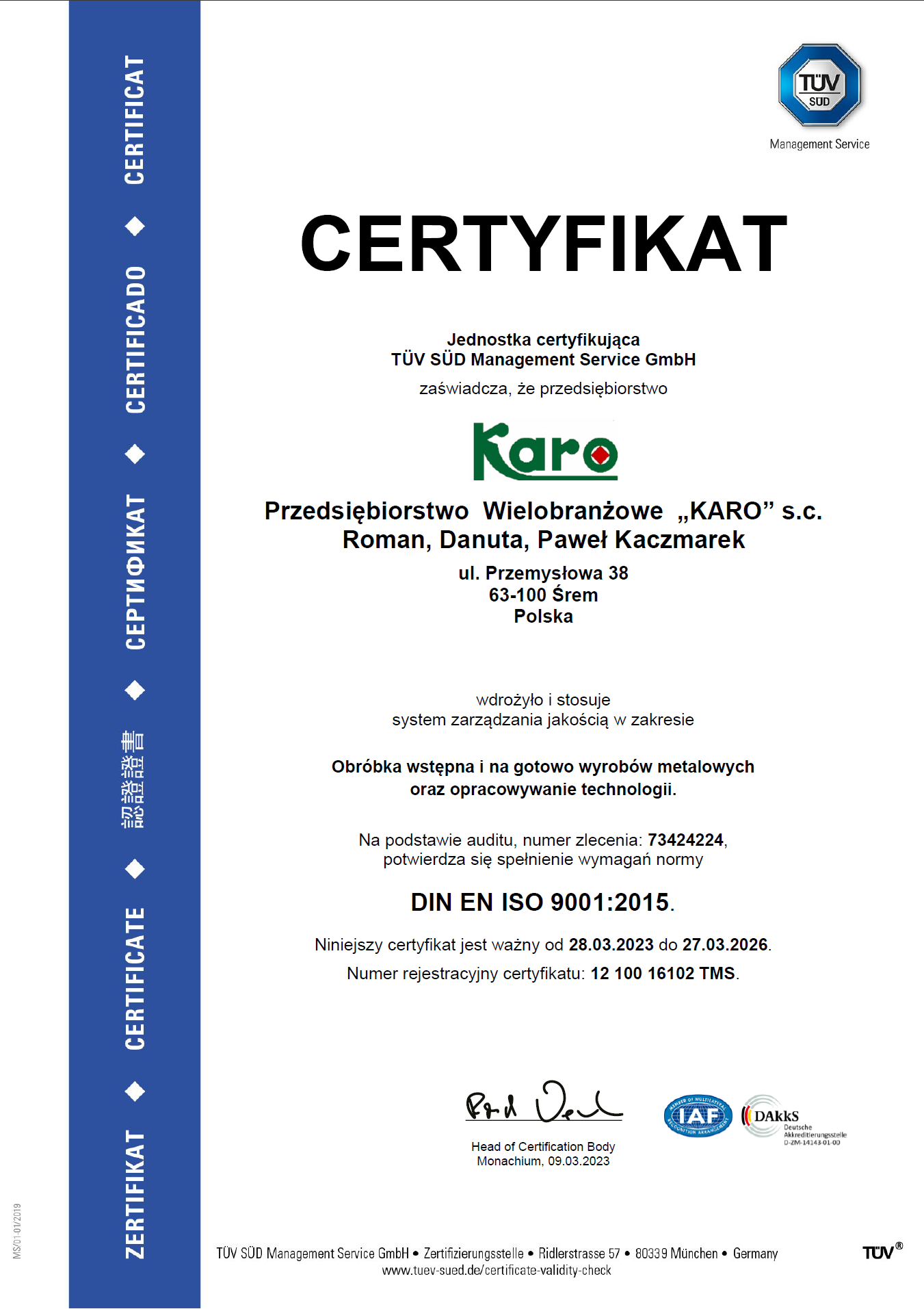 Przedsiębiorstwo Wielobranżowe "KARO" s.c. Roman, Danuta, Paweł Kaczmarek ul. Przemysłowa 38, 63-100 Śrem tel./fax + 48 (61) 281 94 11